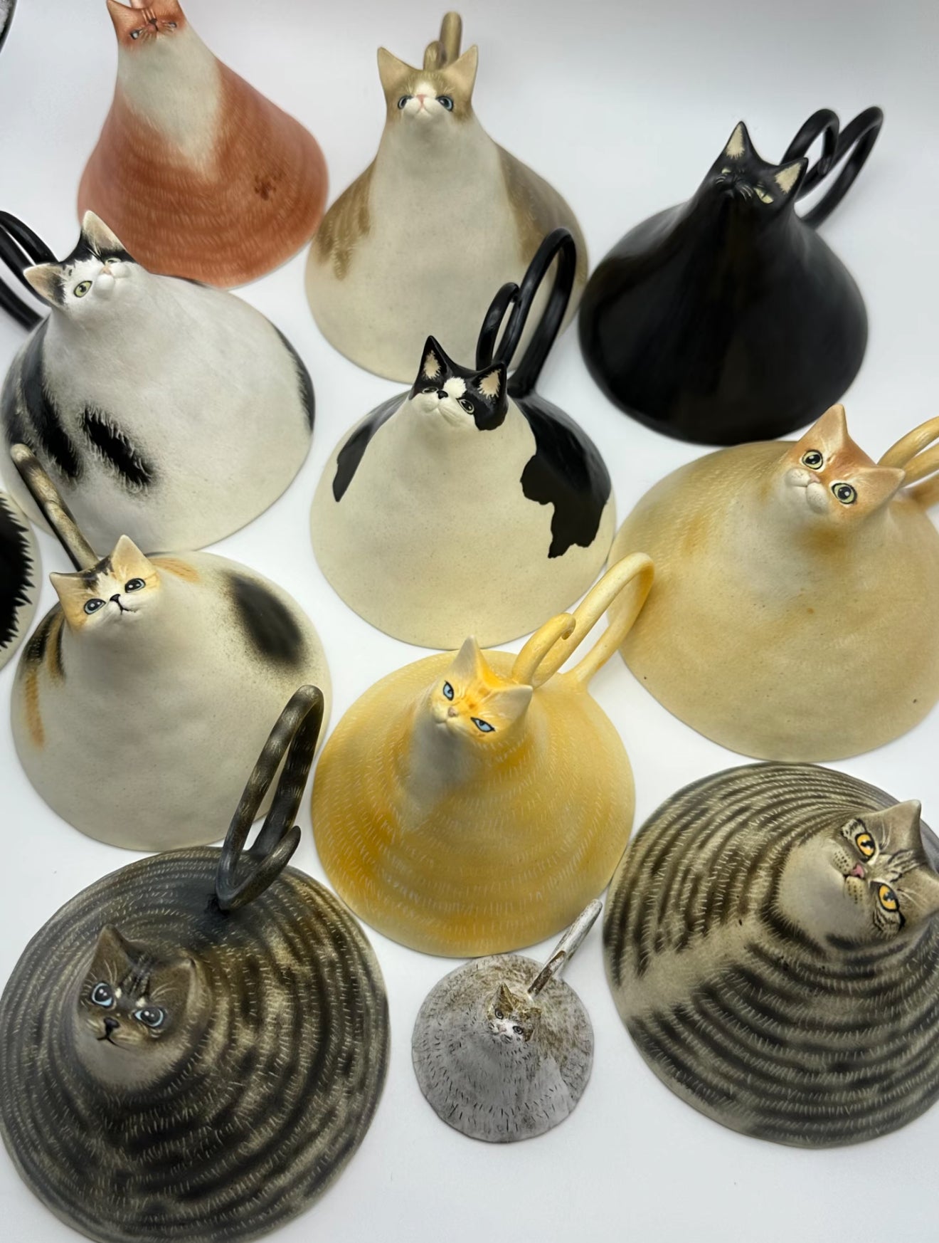This whimsical collection features various cat designs including tabby stripes, calico patterns, tuxedo cats, spotted cats, and solid colors. Each cat is sculpted with incredible detail and personality, from their sweet facial expressions to their gracefully curved tails that serve as handles.