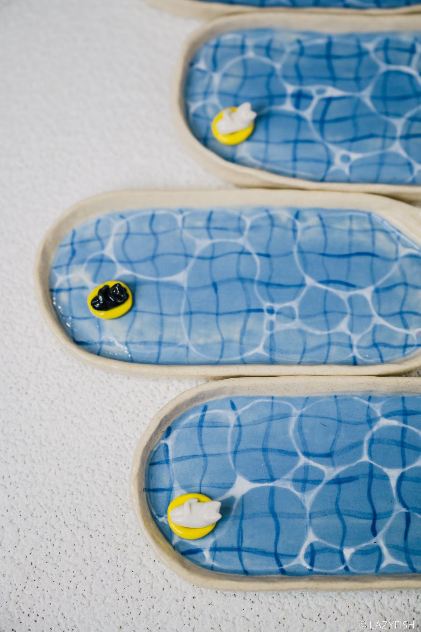 Dive into whimsy with this charming handmade ceramic plate featuring a serene blue pool design complete with an adorable cat floating on a yellow inner tube.