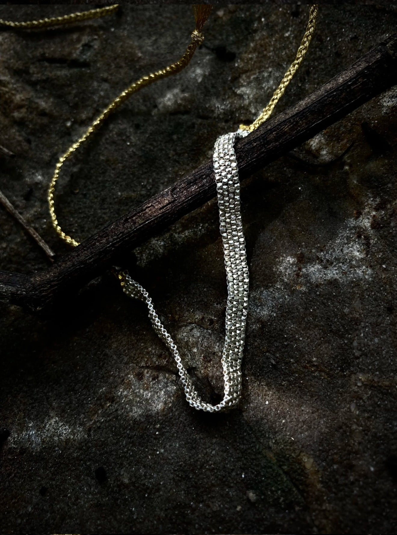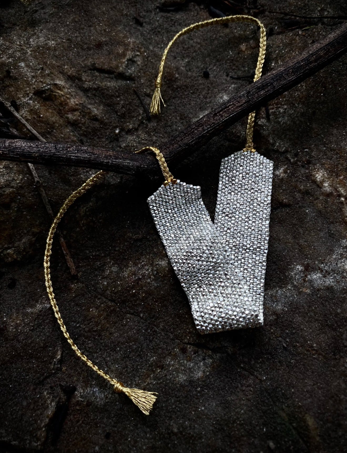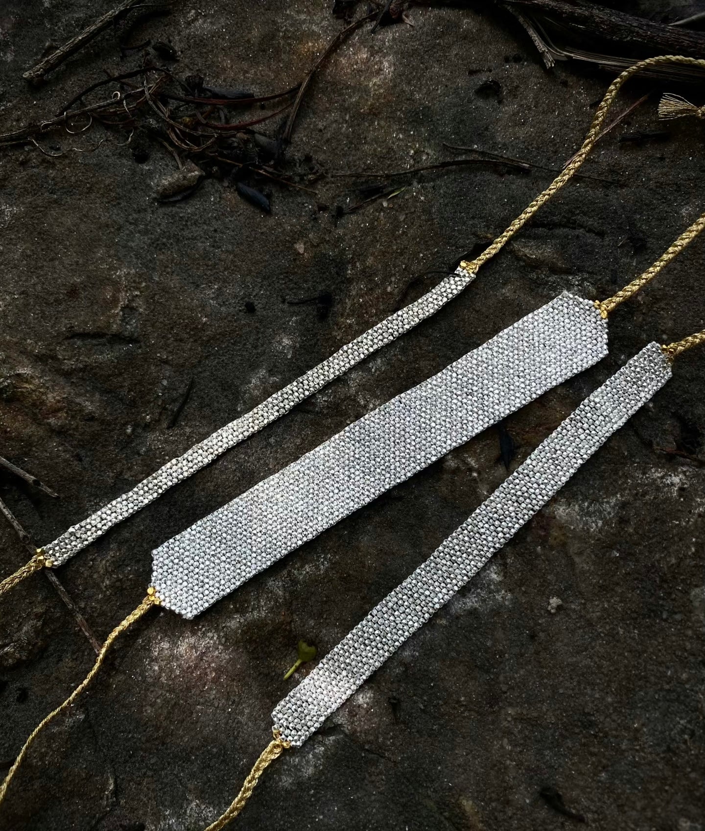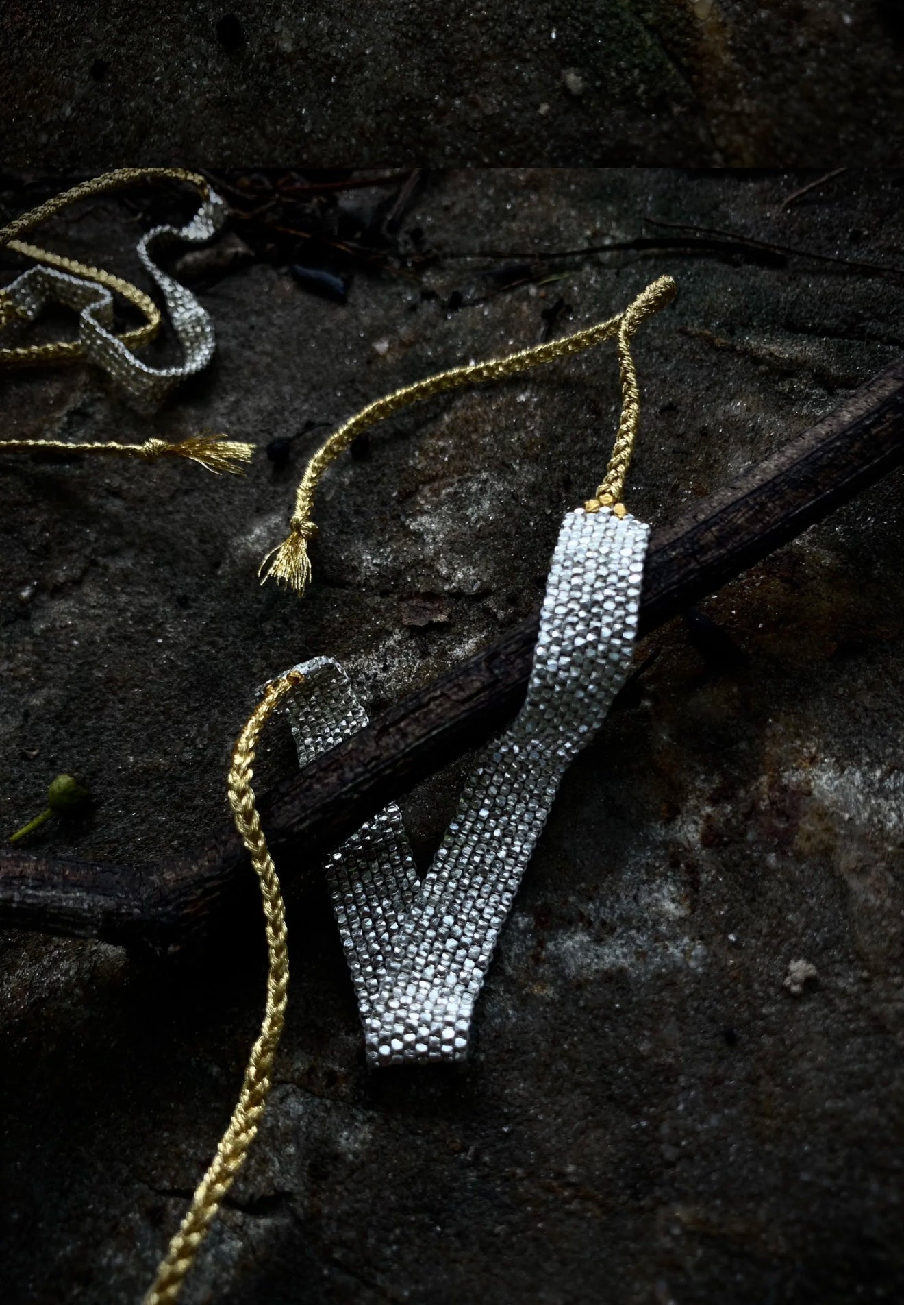 - Adjustable braided cord with tassel ends (gold or silver)